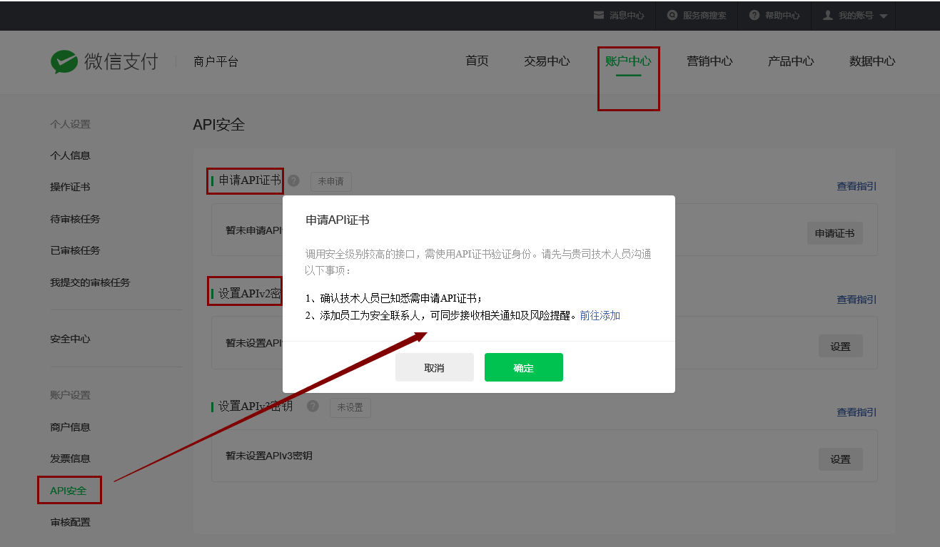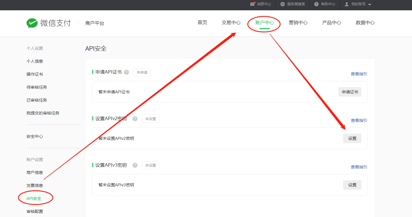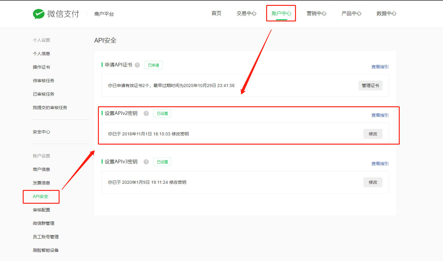 3、微信支付密钥(apisecret):登录微信商户平台(pay.weixin.qq.com)– 账户中心 — API安全 — 设置APIv2密钥