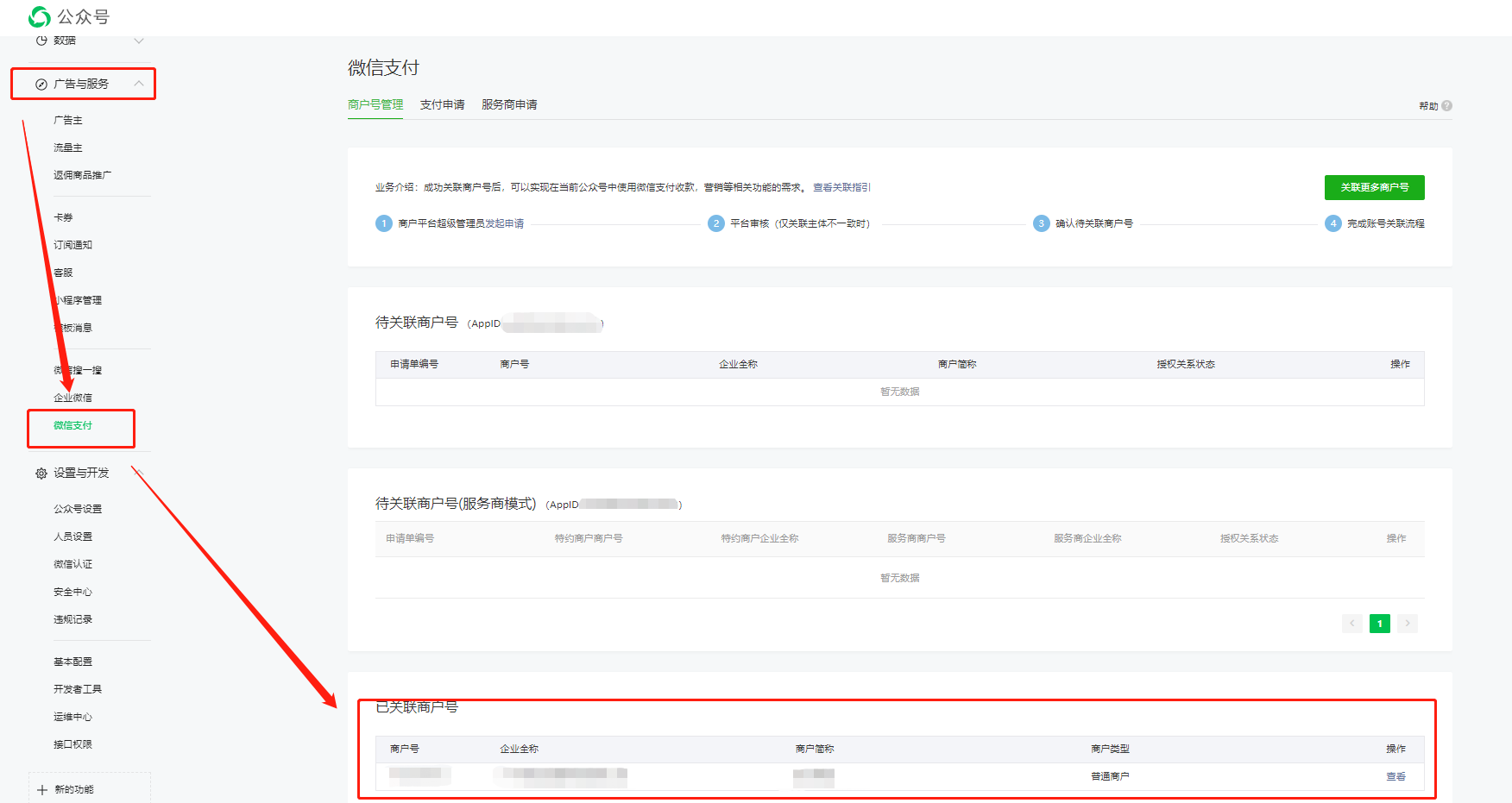 开通好后,公众号平台微信支付会显示已关联商户号。