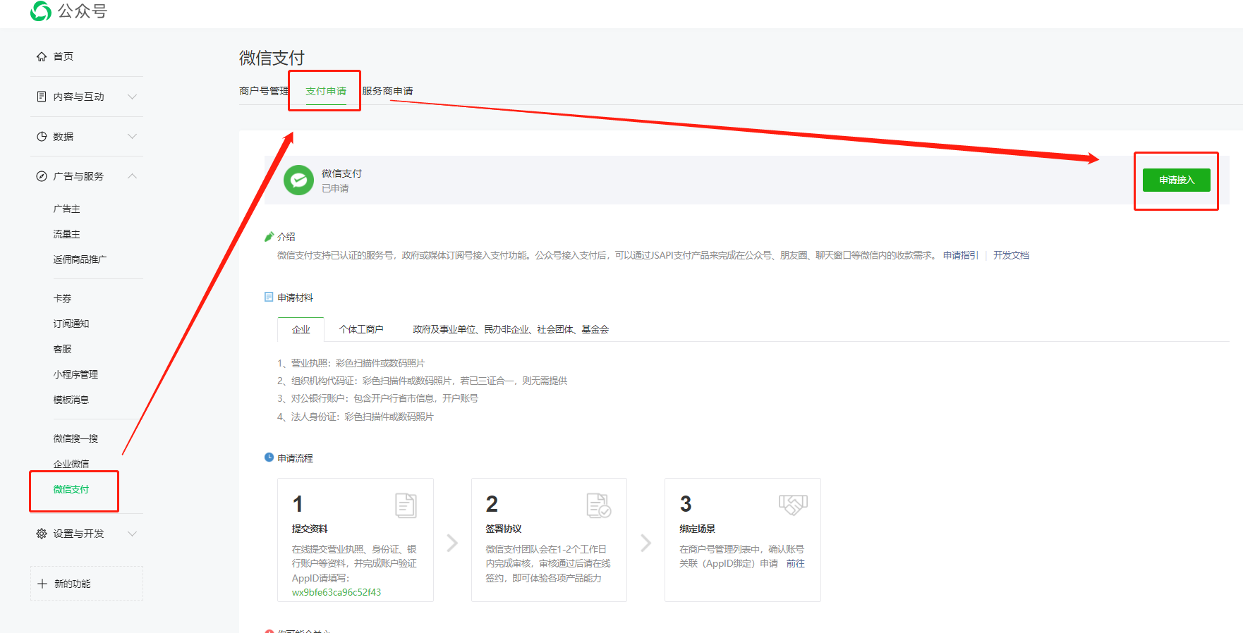 请登录公众平台mp.weixin.qq.com,开通微信支付。注:必须申请企业账户的微信支付;公众号和微信商户号建议同一个企业主体。