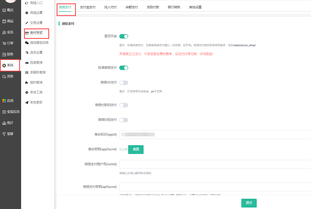 微信支付配置(路径:后台系统–支付方式–微信支付–开启微信支付和标准微信支付)