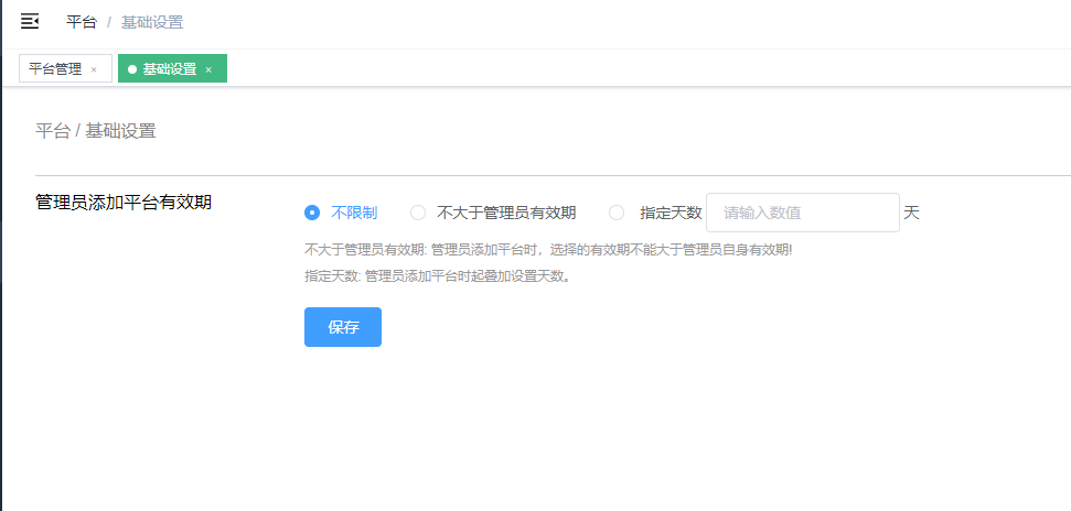 基础设置作者: aishidai / 2025年11月23日 管理员添加平台有效期,可设置不限制时间,不大于管理员有效期和指定天数 不大于管理员有效期: 管理员添加平台时,选择的有效期不能大于管理员自身有效期! 指定天数: 管理员添加平台时起叠加设置天数。