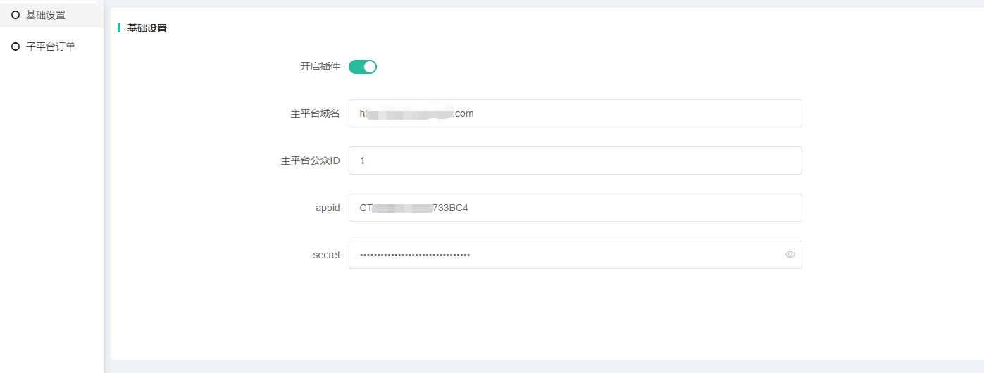(4)appid、secret:已在主平台插件端添加了子平台(可以在微信借权支付-主平台插件—子平台管理-查看密钥查询)