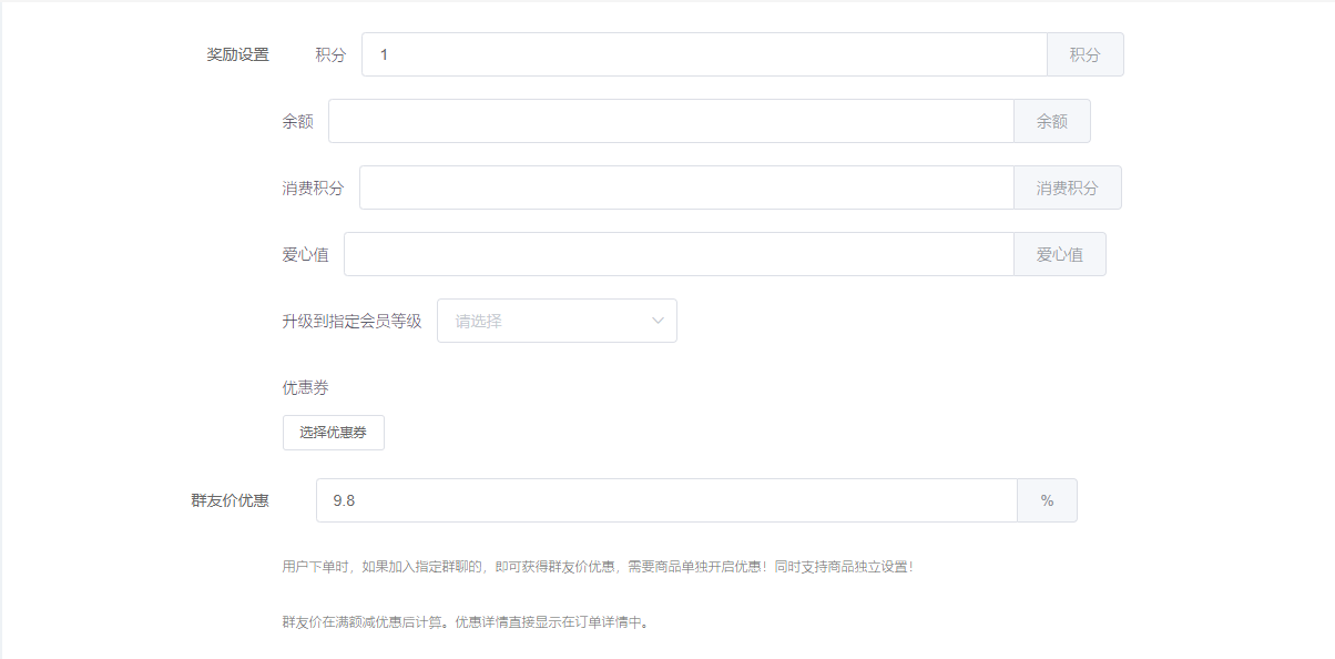 奖励设置:设置领取页面的奖励积分、余额、消费积分、优惠卷,升级到指定会员等级(如选择等级比会员自身所处会员等级低,不会降级)