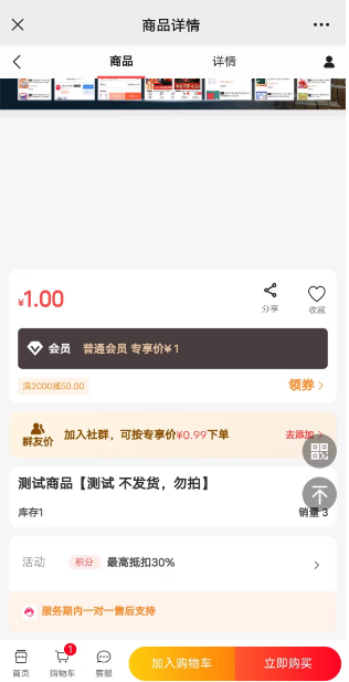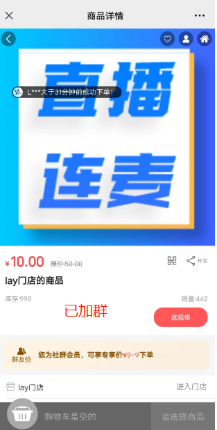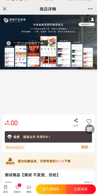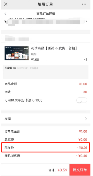 加入群聊–商品详情页显示效果,提示您为社群会员,可享受专享价进行下单,提交订单页面会显示群友价抵扣