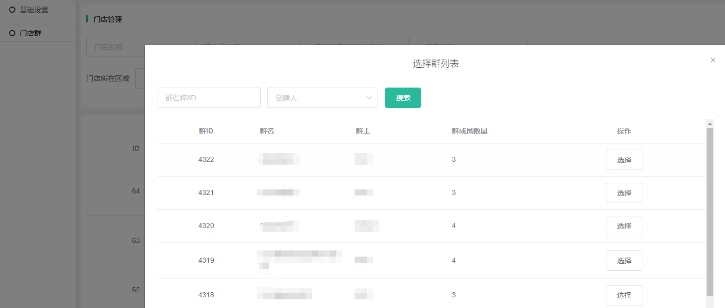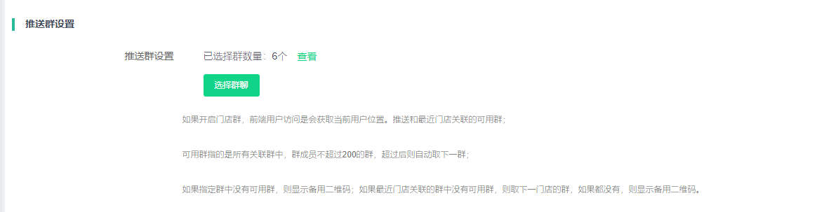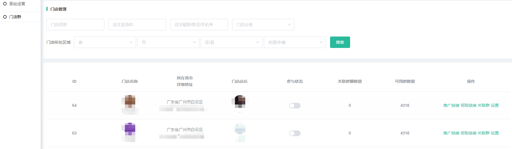 1、基础设置开启门店后,只有开启了参与状态和有关联群的门店才会在前端加群页显示