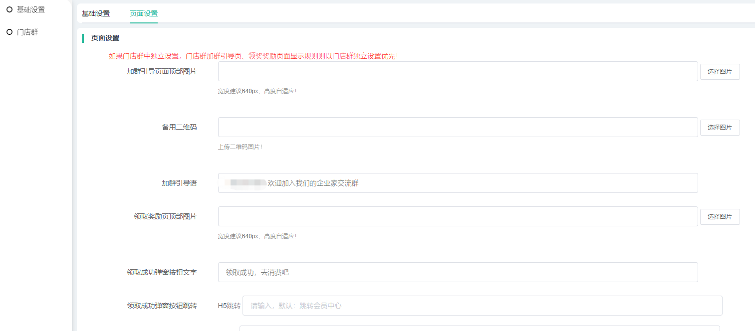 如果门店群中独立设置,门店群加群引导页、领奖奖励页面显示规则则以门店群独立设置优先!