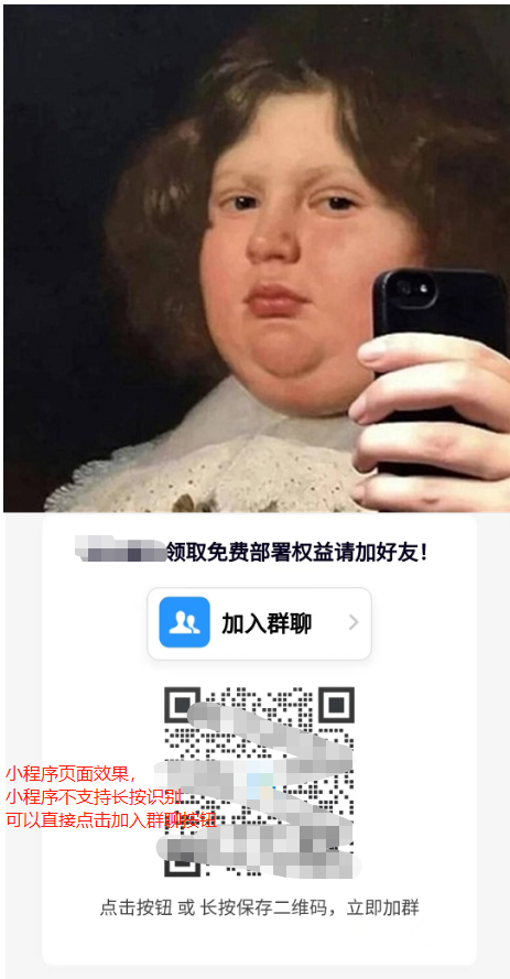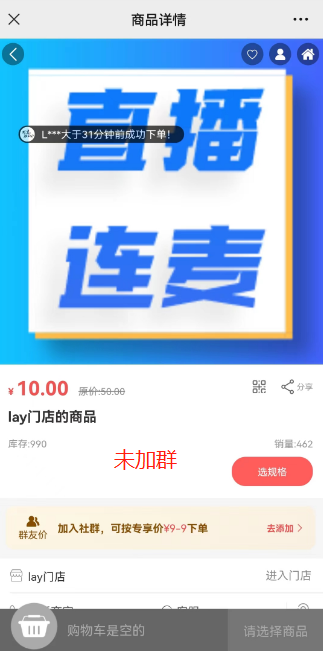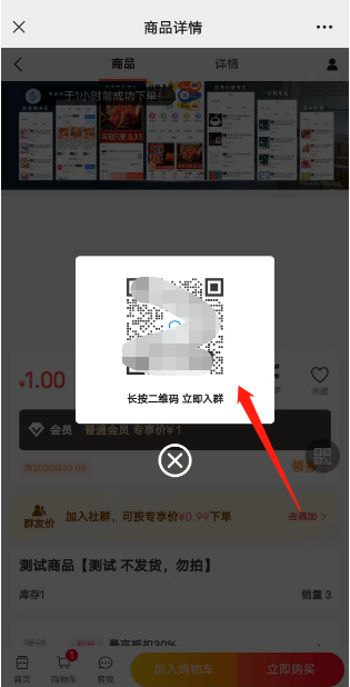 商品详情页显示效果,未加入群会显示去添加,点击去添加弹出加群二维码,长按识别加群,加入群聊(需要选择商品模板02)