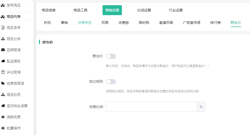 1、社群营销开关按钮:控制前端商品是否能使用群友价