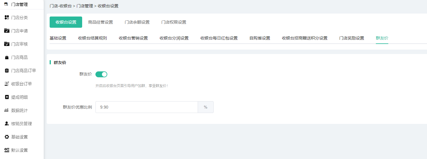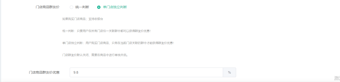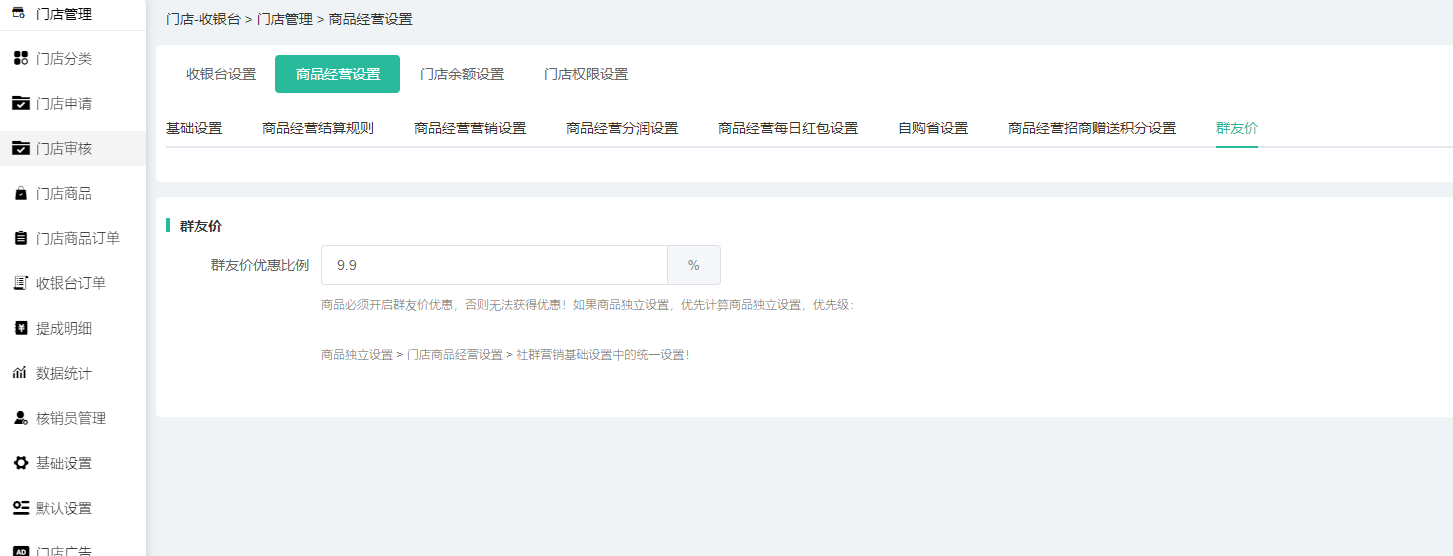 群友价优惠比例:只有门店商品群友价是单门店独立判断才是使用该设置的比例