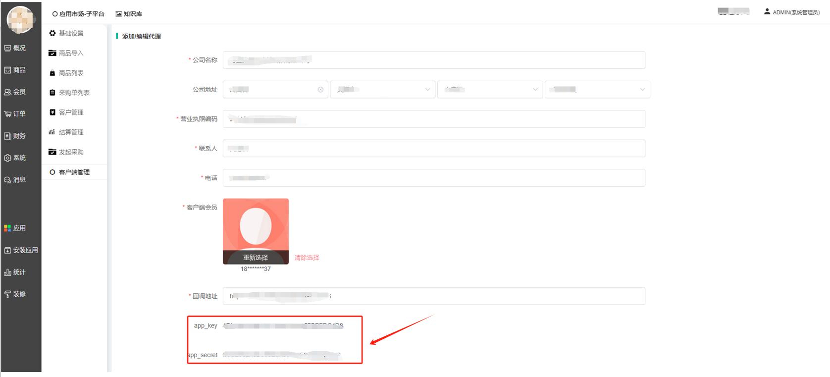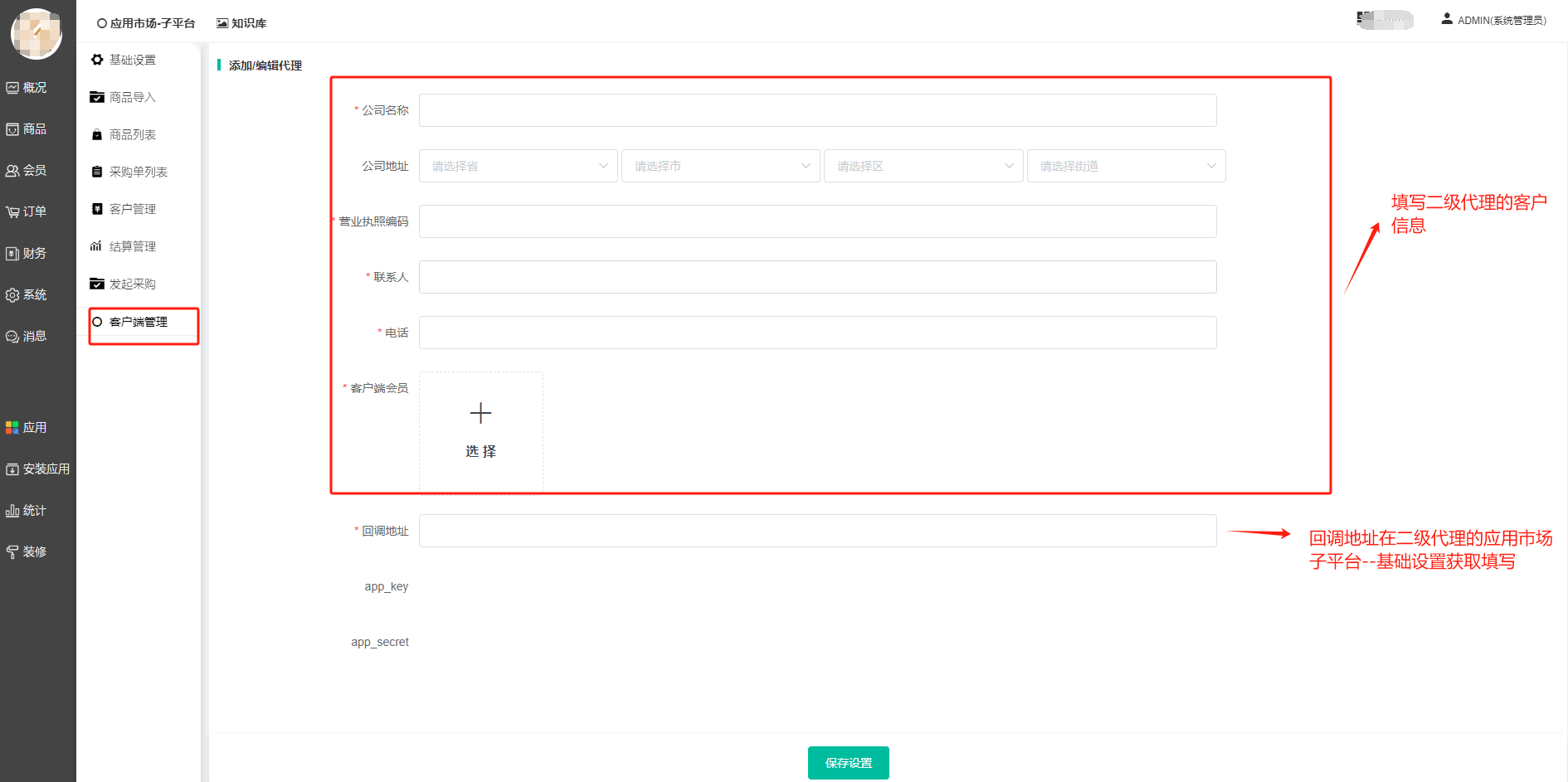 1-4.返回第1-2点,一级代理在客户端管理——客户端详情获取app_key和app_secret填写在二级代理的应用市场子平台