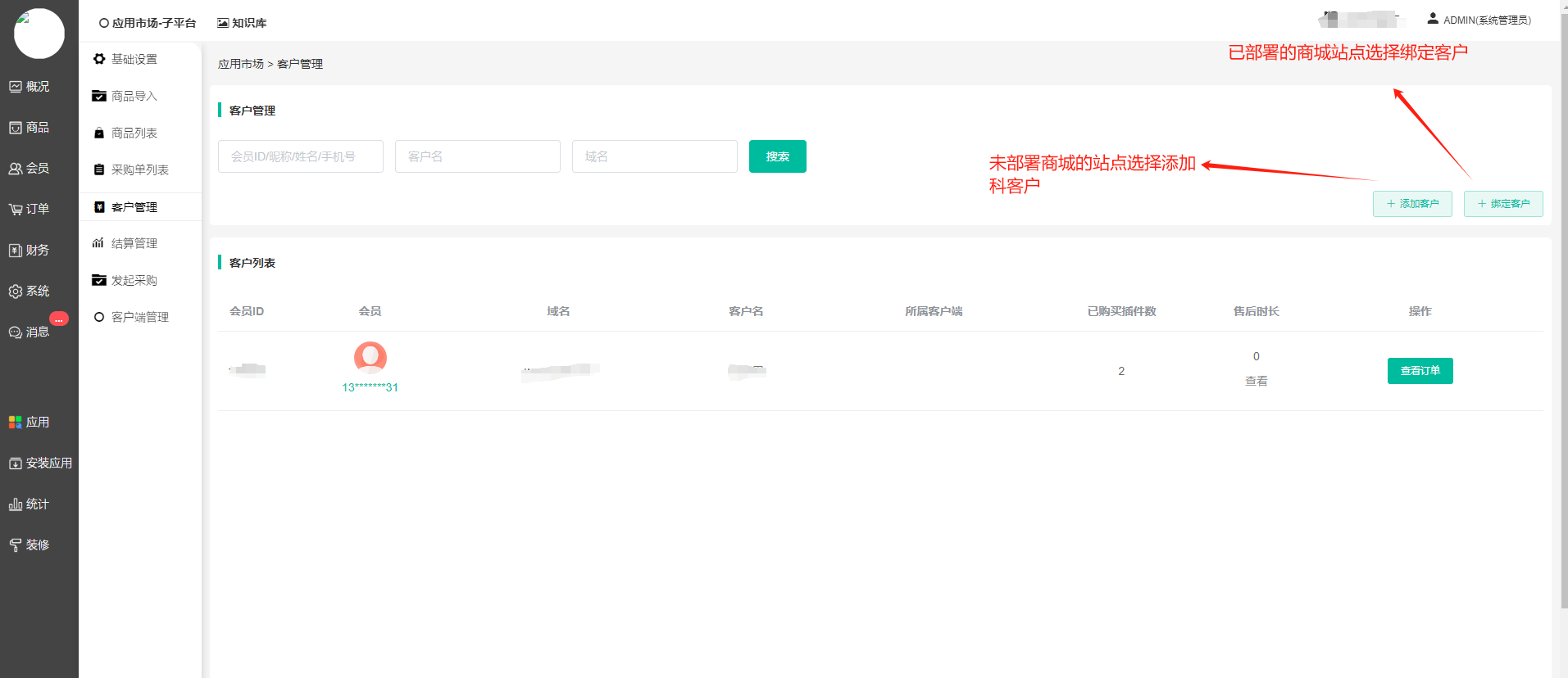 搜索客户,查看客户对应绑定的会员信息,购买插件数量,订单详情;若客户不存在需要先添加或绑定