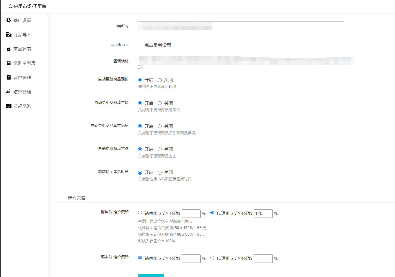 2-2.定价策略:销售价、成本价定价策略,开启后销售价、成本价将使用应用市场定价策略计算后的价格,本地定价策略失效。