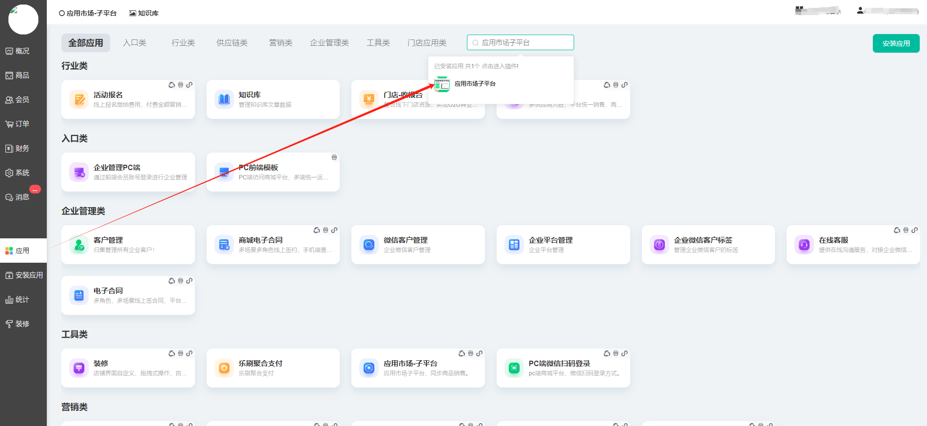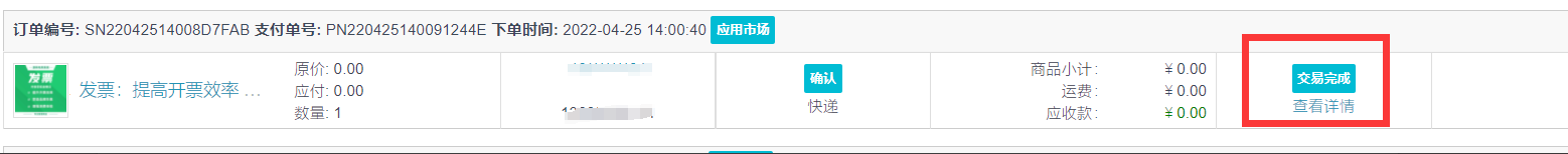 4、显示交易完成,插件完成授权,客户自己在商城后台-安装应用-未安装进行安装插件即可