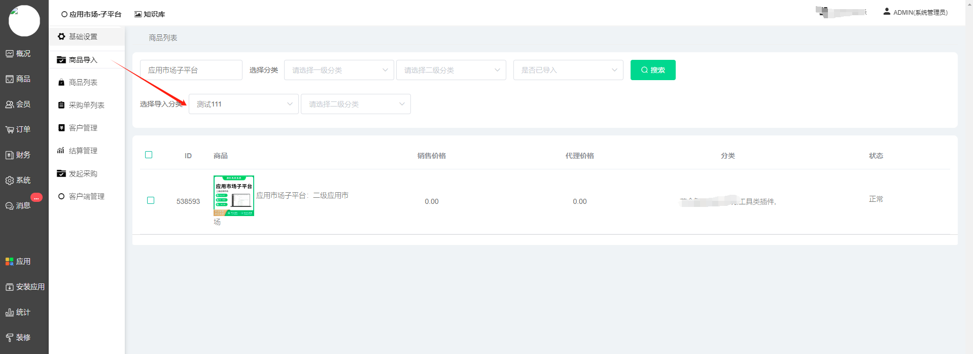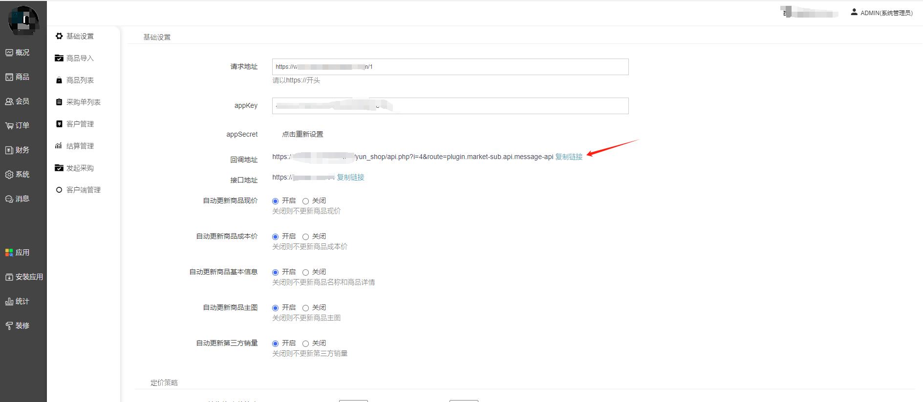 1-3.在二级代理进入应用市场子平台插件——基础设置将请求地址填写上(具体可查看一级代理的接口地址)