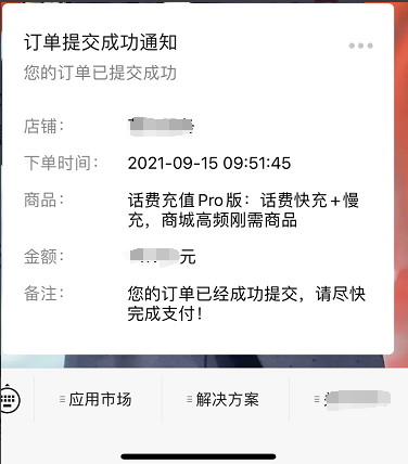 2、如果需要授权付费插件(有预存款的无需操作,采购后扣除预存款知道完成授权),原先提交绑定应用市场的会员,公众号会推送一条订单提交成功通知