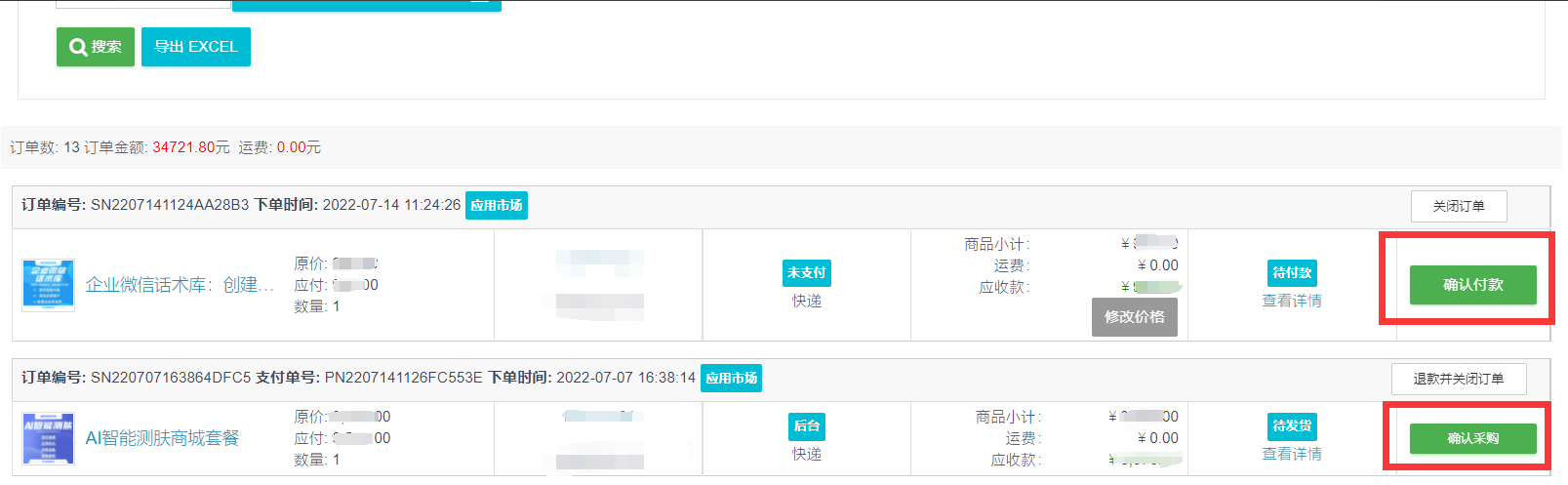 3、客户付款后,后台应用市场子平台-采购单列表订单会显示待发货,代理有预存款的点击确认采购,自动扣除预存款完成授权,若无预存款在公众号进入未支付支付后才算完成订单
