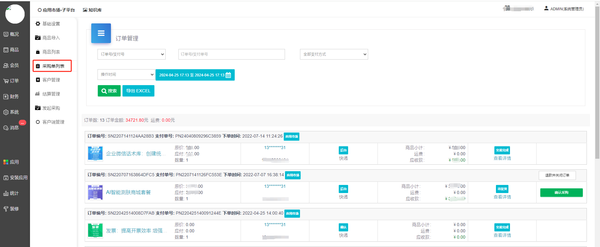 商城会员通过前端购买应用市场商品的订单列表,支持订单相关操作。(通过后台发起采购的不会在此显示)