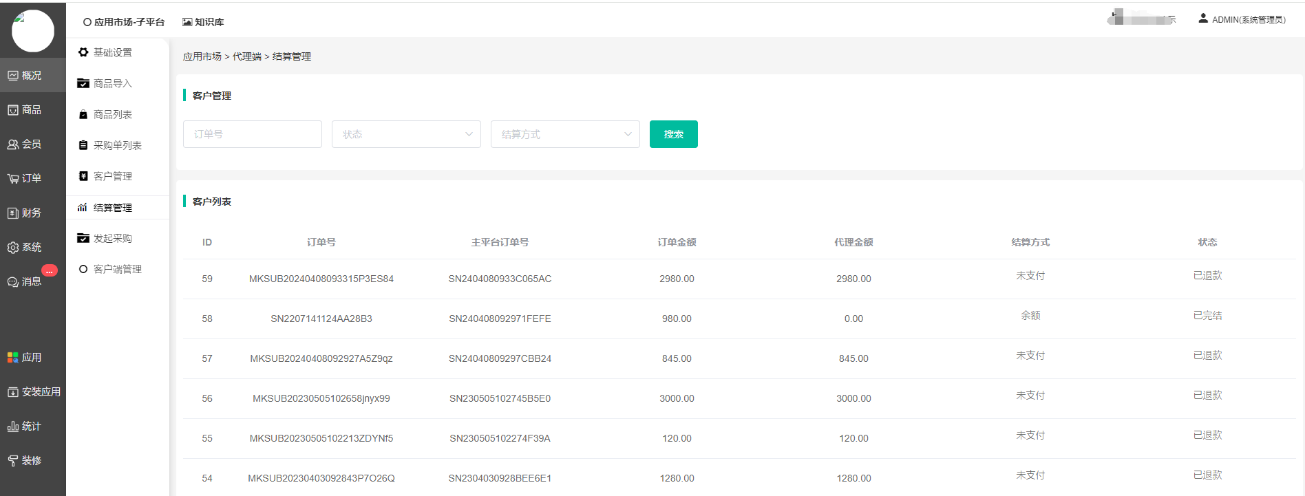 数据管理,可清晰了解订单金额、代理金额,结算方式和订单状态