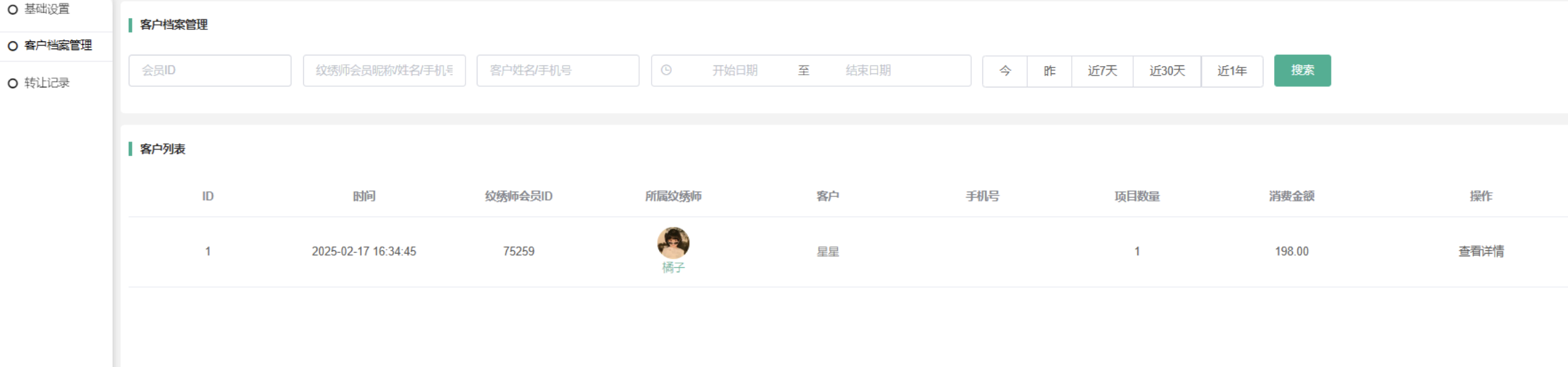 二、点击进入顾客档案管理页面,显示管理的所有顾客档案,可通过手机号、客户名称、项目名称、老师名称筛选