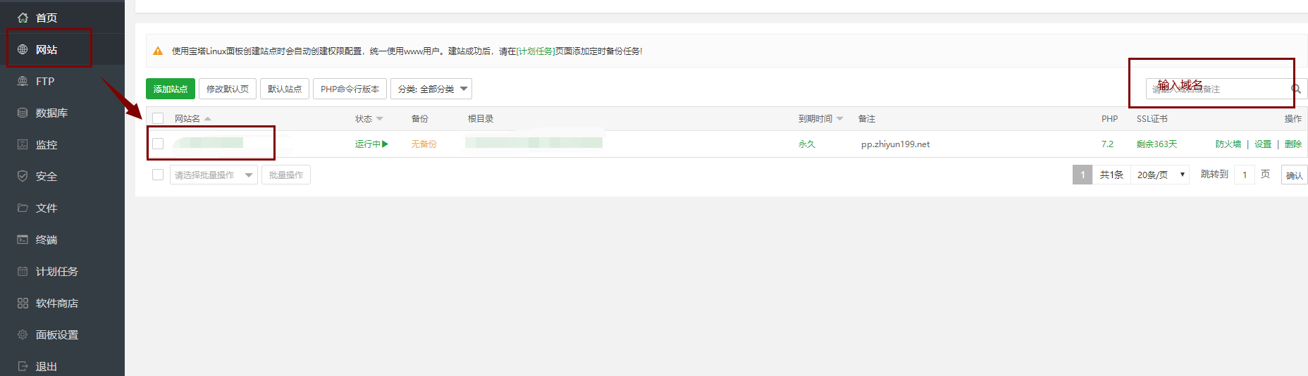 1、首先登陆你的宝塔Linux面板后台,在左侧找到【网站】菜单,在右上角的搜索输入域名后,点击进入