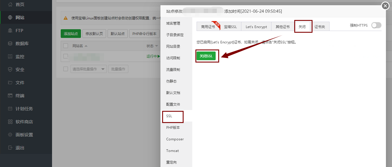 2、如你已启用Let’s Encrypt证书,必须先点击关闭(如未启用可不用操作)