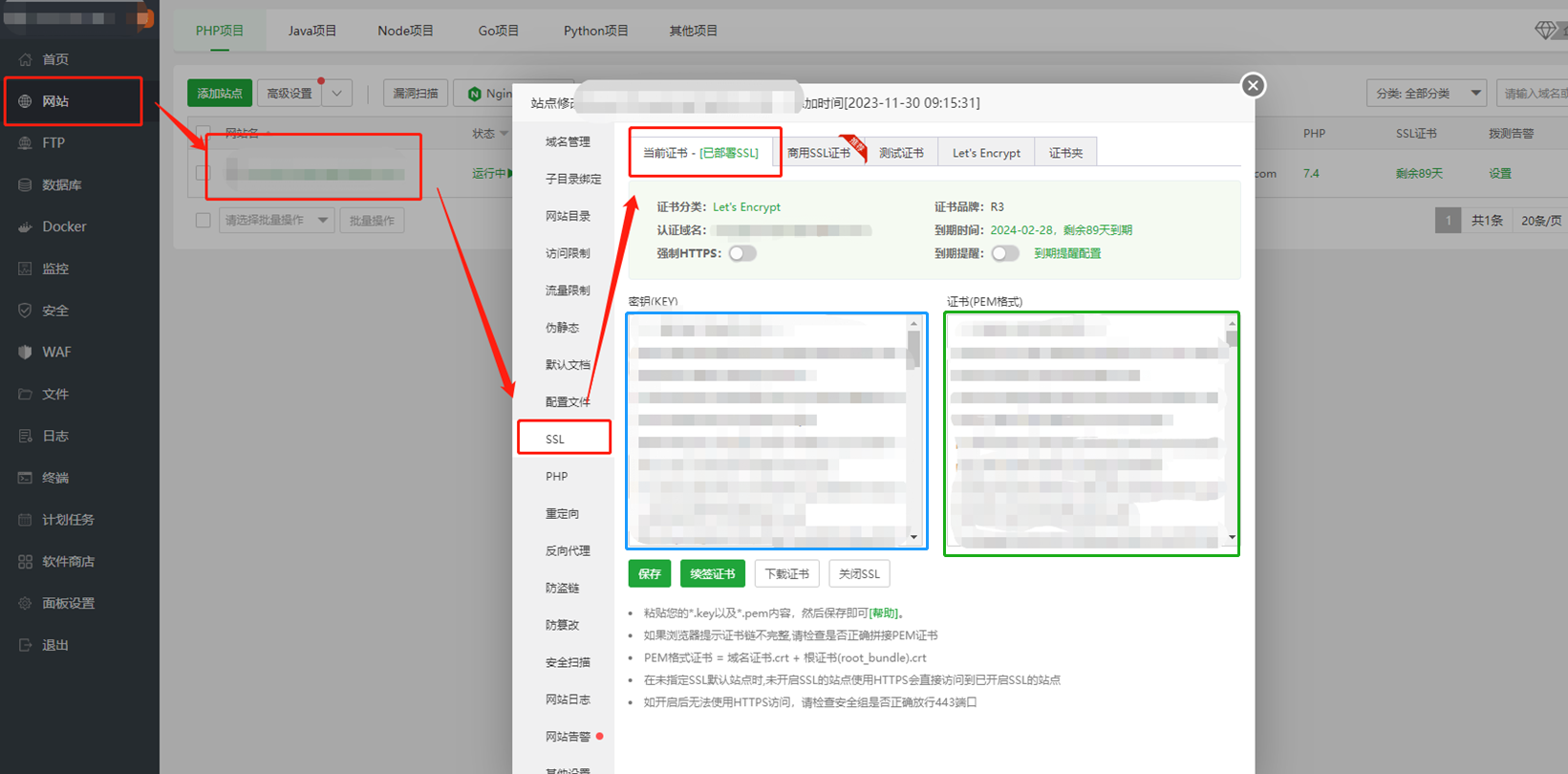 点击SSL-当前证书,登录域名对应运营商,先申请证书后下载,粘贴您的*.key以及*.pem内容,然后保存即可