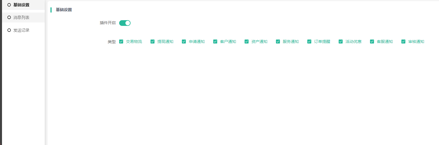 后台插件支持启用站内消息功能并设置指定消息发送通知,未勾选的则不发送通知。如下图