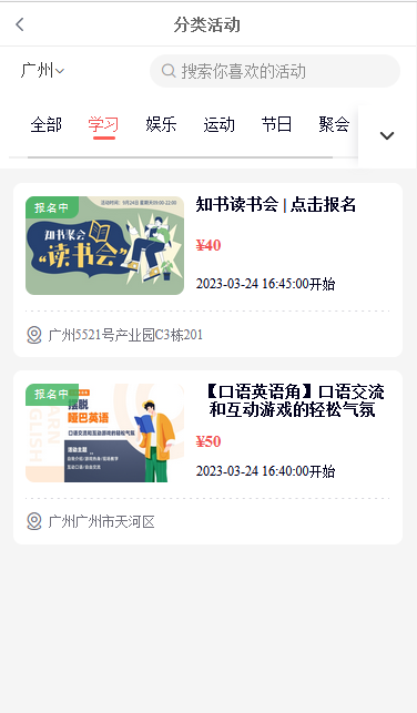 活动i详情页,查看相关的活动信息,底部首页(点击则回到活动首页),我的(可查看我的报名和关注活动),关注(可关注活动)