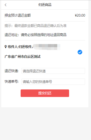 支持添加多个归还地址:联系人、手机、邮编、归还地址、是否默认地址,用户归还租赁商品时可以选择归还到添加的任意地址。