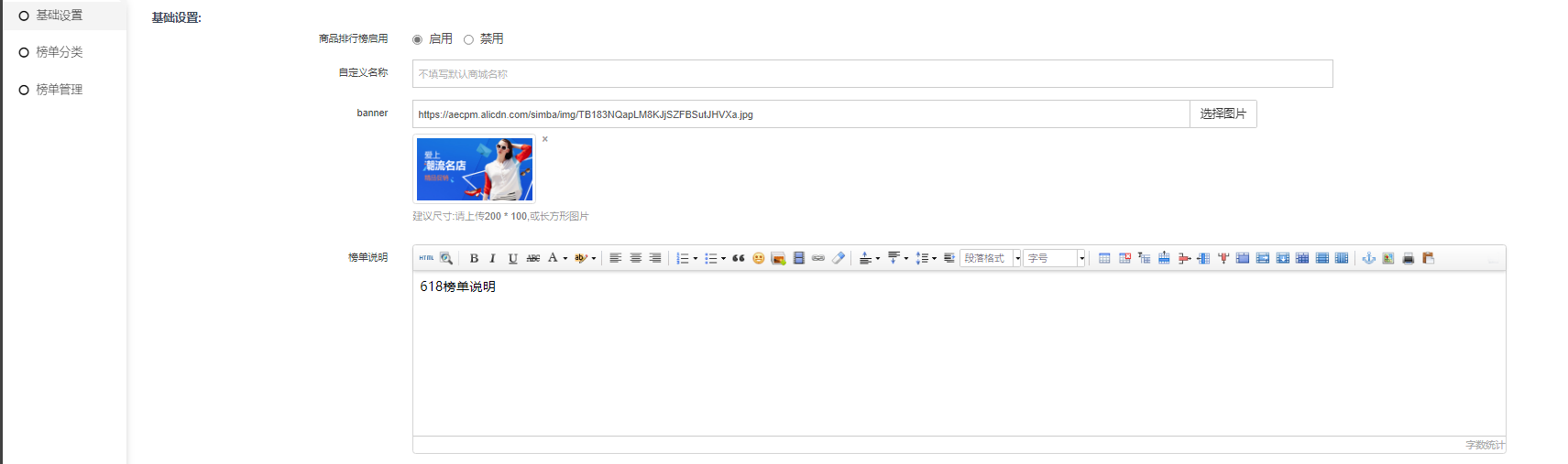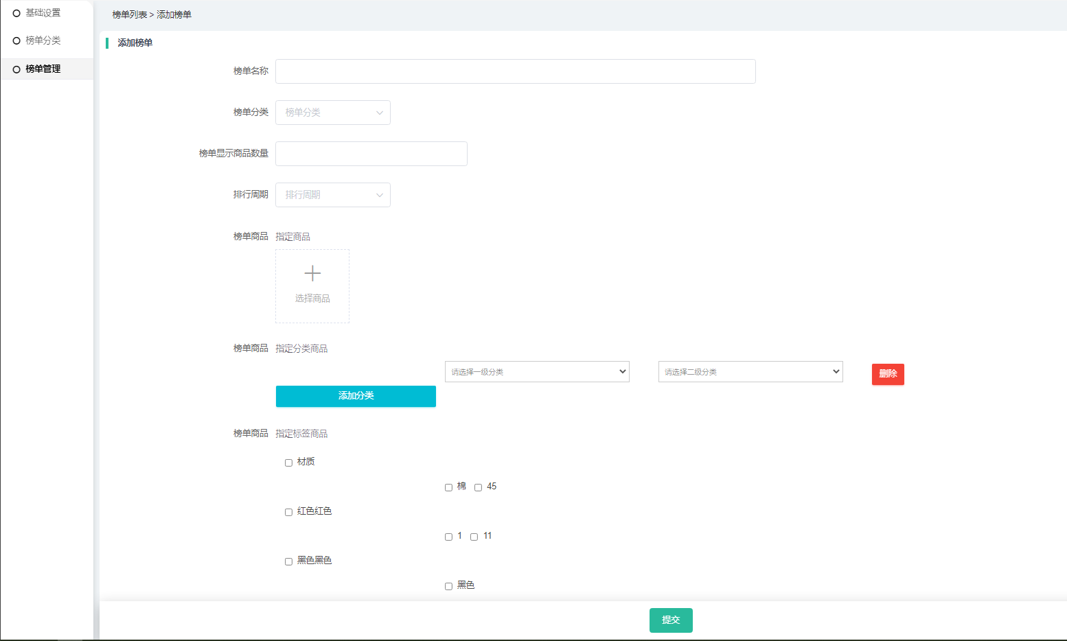 填写榜单名称、分类、banner图等;设置榜单数据统计周期,支持统计天、周、月、季度销售数据生成排行榜;根据指定商品、商品分类、商品标签选择榜单包含商品。
