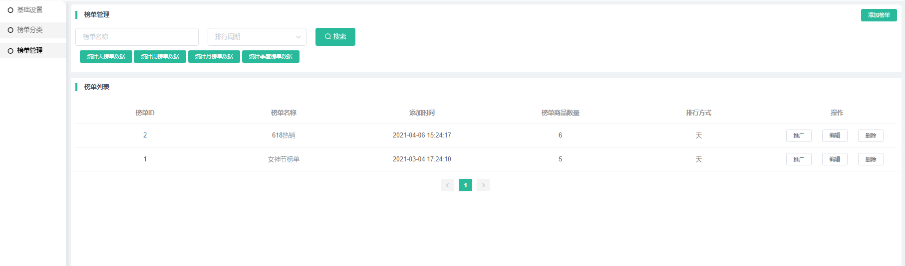 榜单列表:查看管理多个商品榜单,手动执行排行榜数据生成。