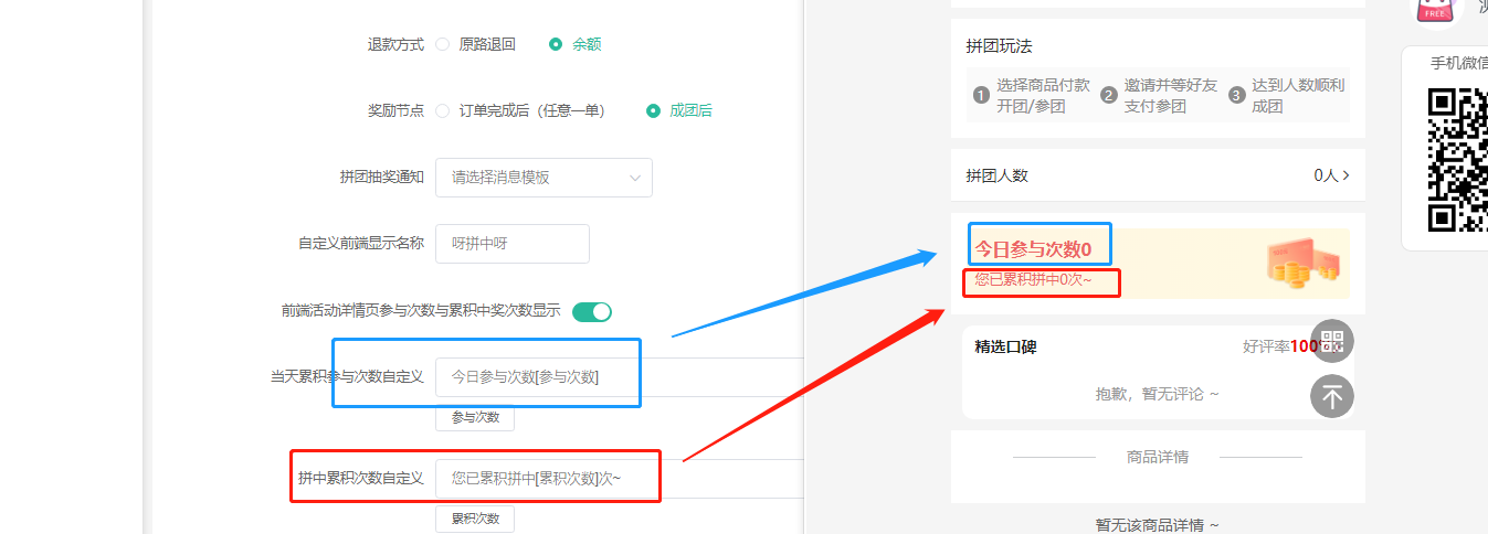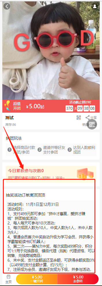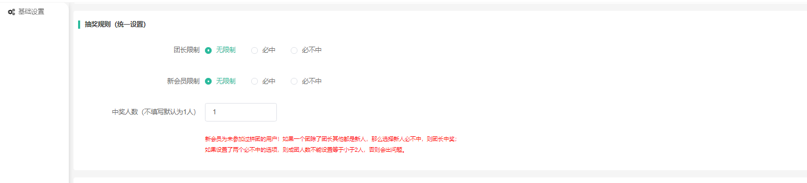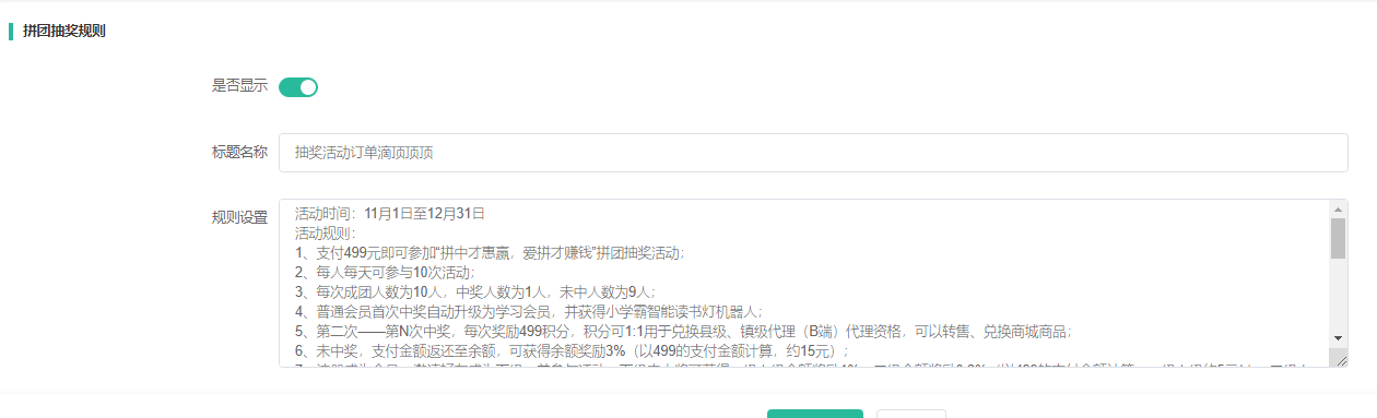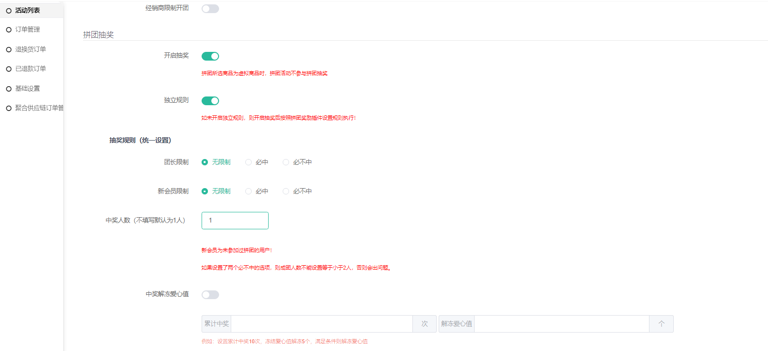 特别注意:拼团活动要用拼团奖励规则,拼团活动务必开启抽奖,支持独立规则,不走拼团奖励统一设置。