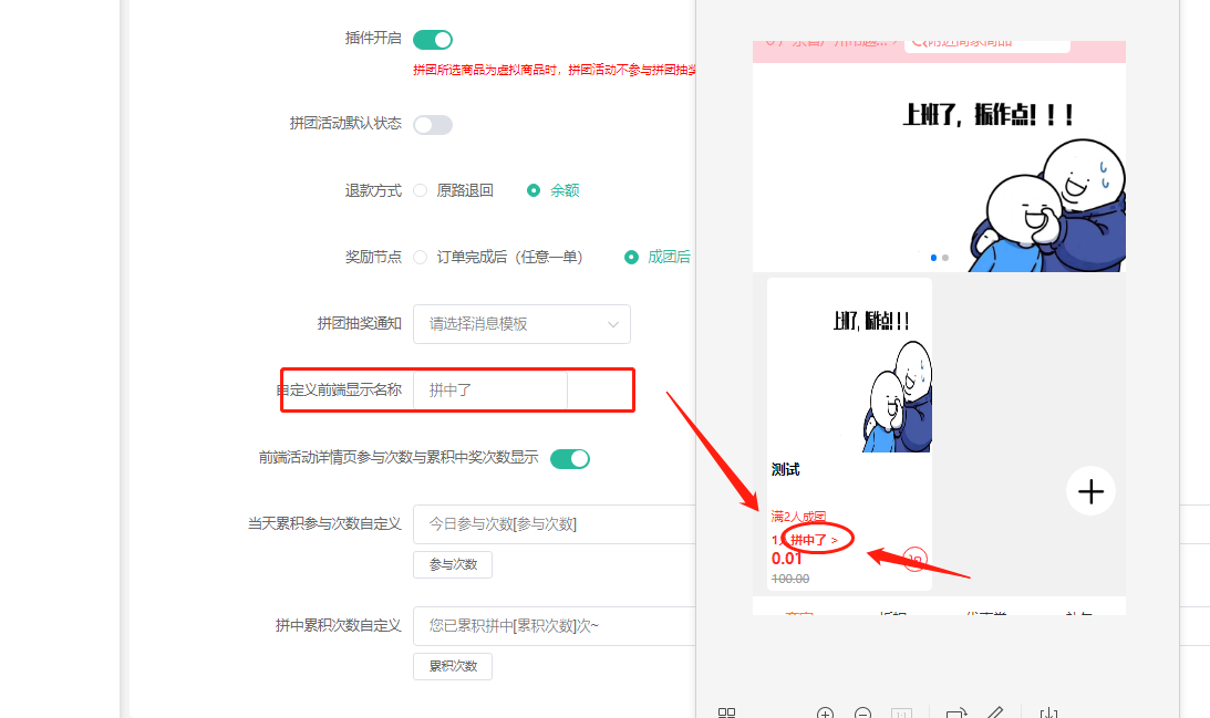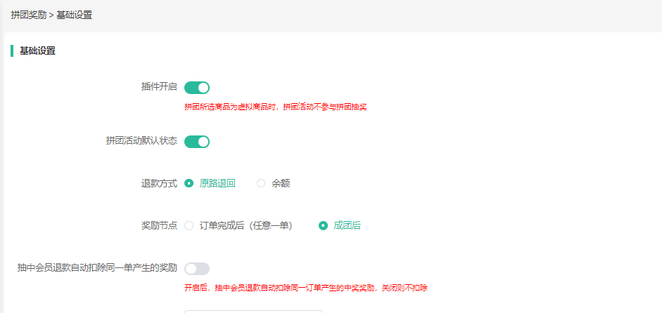1、开启插件:开启后拼团活动创建可以设置拼团奖励;
