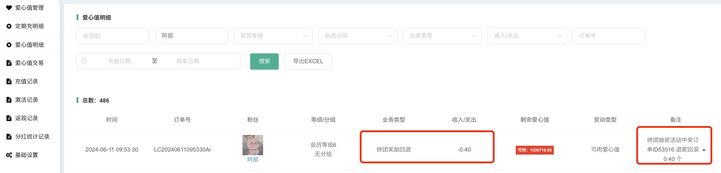 支持设置抽中会员(获得产品的会员)、未抽中会员(退款的会员)奖励余额、积分、消费积分。