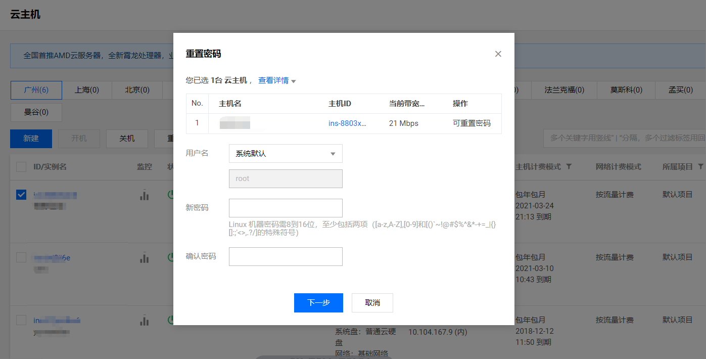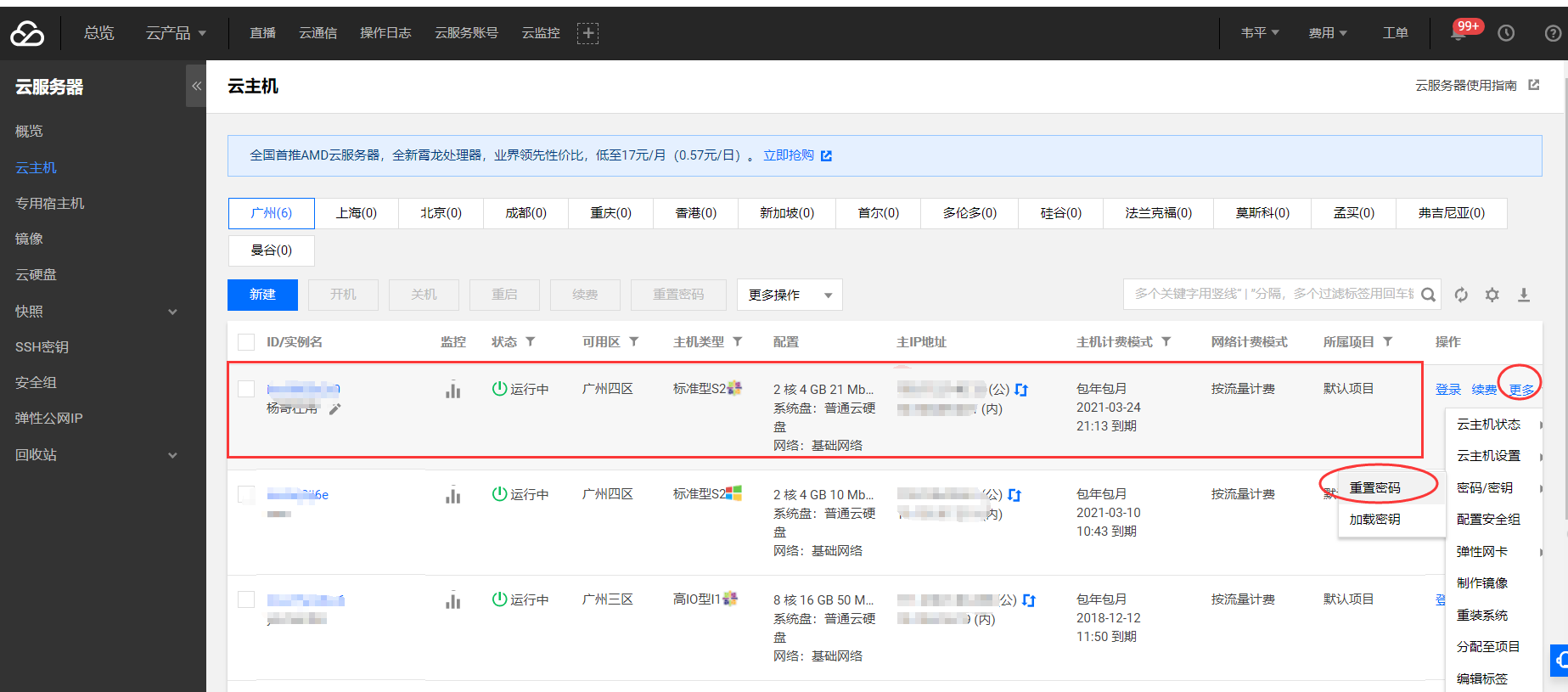 如果您忘记了服务器密码,或者要修改服务器密码,需要登录腾讯云/阿里云进行重置,这里以腾讯云为例: