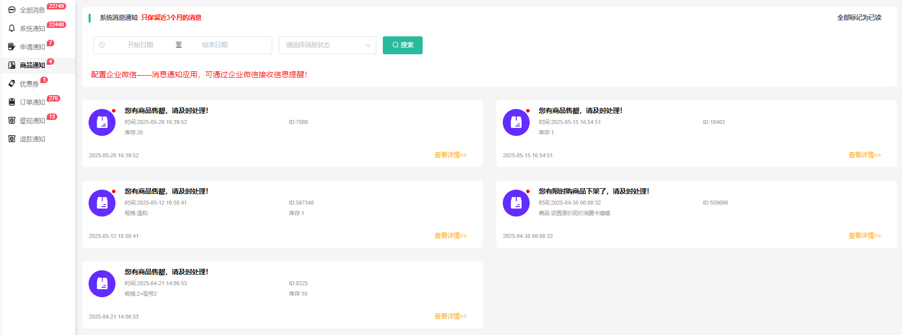使用场景系统用户下单、用户申请供应商、门店、主播等角色,用户提现,商品库存不足等情况;原需运营人员逐步点击对应板块才能看到具体情况,在运营过程中往往会因为遗落导致未能及时处理。