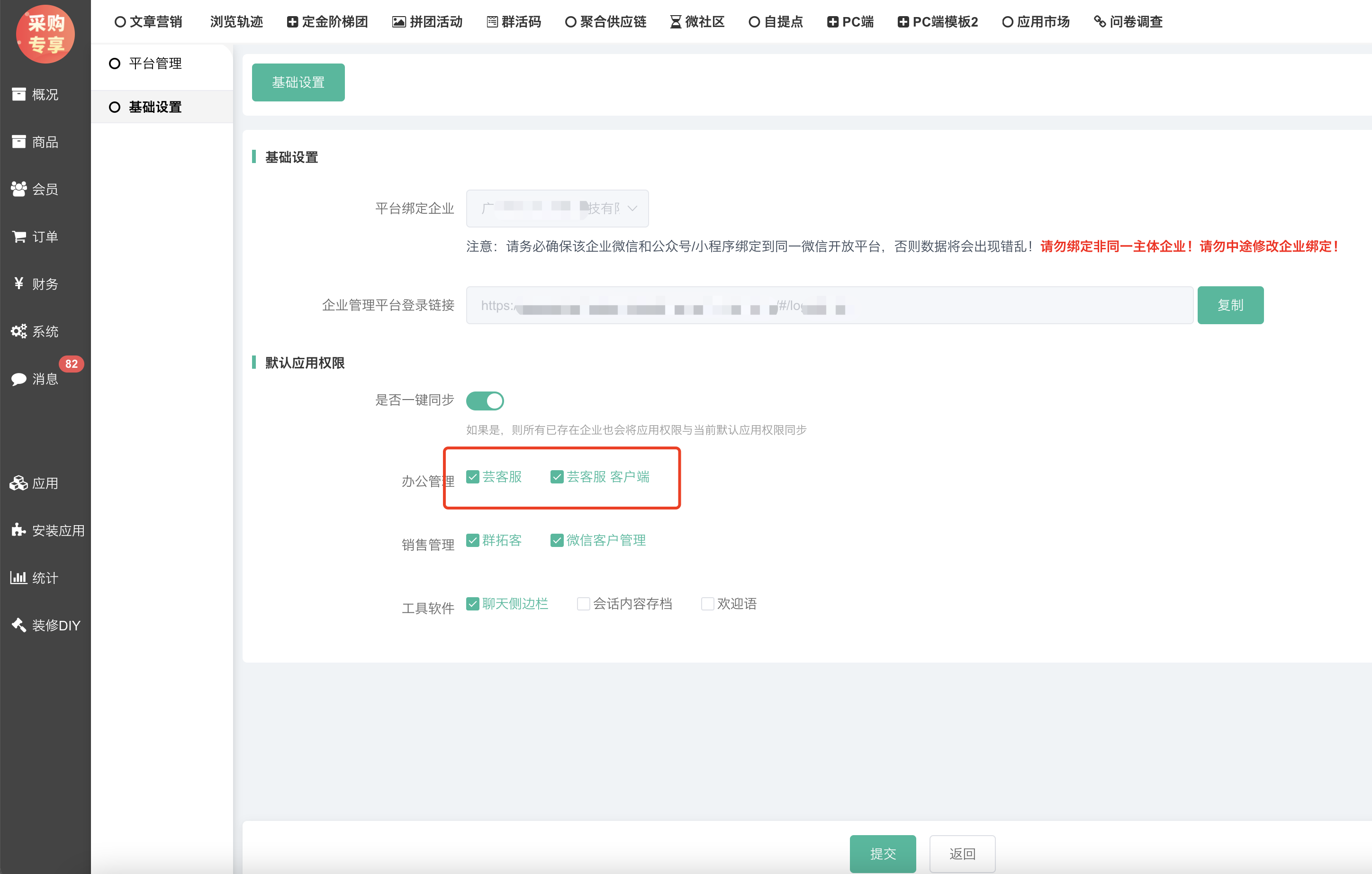 在企业平台管理–基础设置–默认应用权限中勾选在线客服、在线客服客户端,则创建企业时,企业默认具备在线客服使用权限。