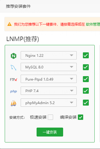 5. 登录宝塔面板的管理后台安装环境把mysql版本支持8.4(首次安装升级8.4的版本是8.4.0,需升级为8.4.5再去一键安装商城),php版本换成7.4,并按照下图选择环境版本编译安装,点击一键安装,然后等候安装完毕即可,可以宝塔后台的左上角看到任务安装列表
