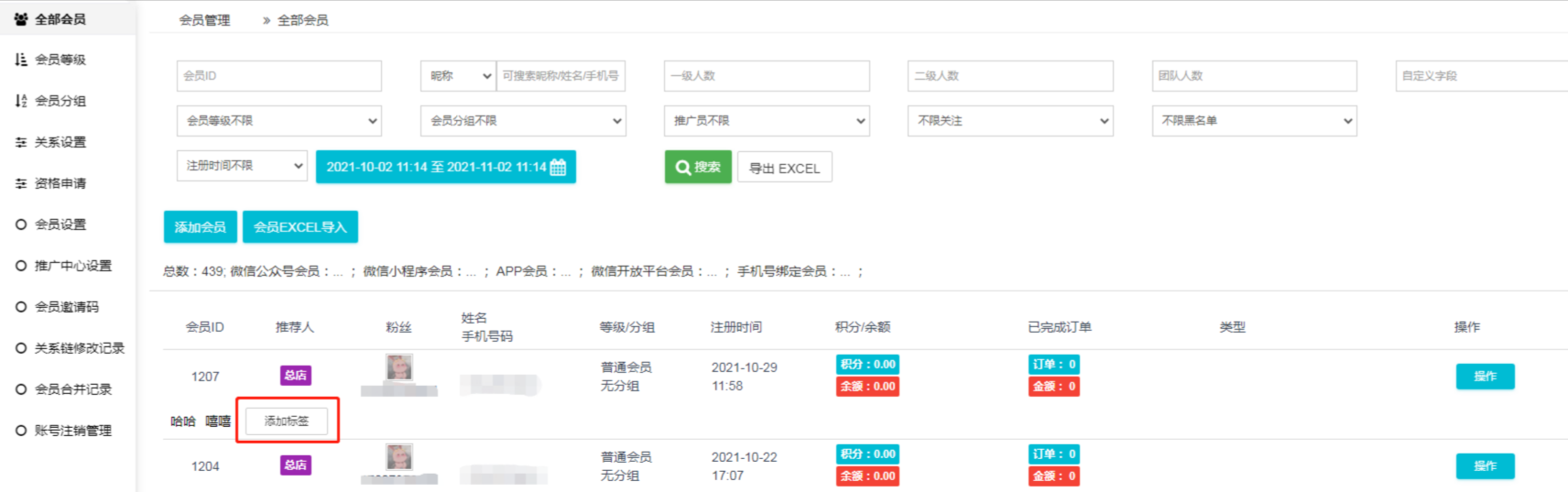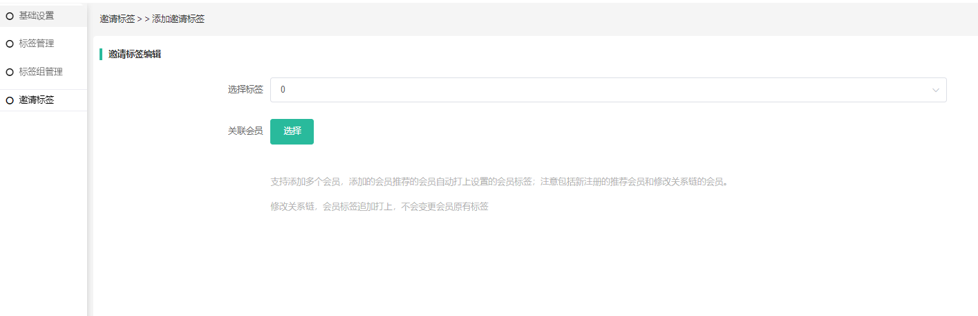 支持添加多个会员,添加的会员推荐的会员自动打上设置的会员标签;注意包括新注册的推荐会员和修改关系链的会员。