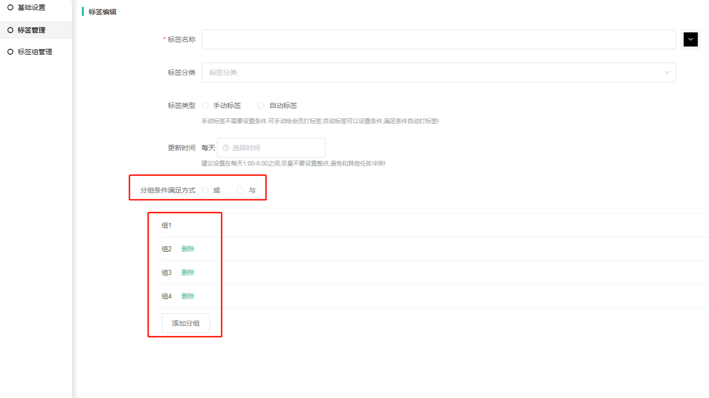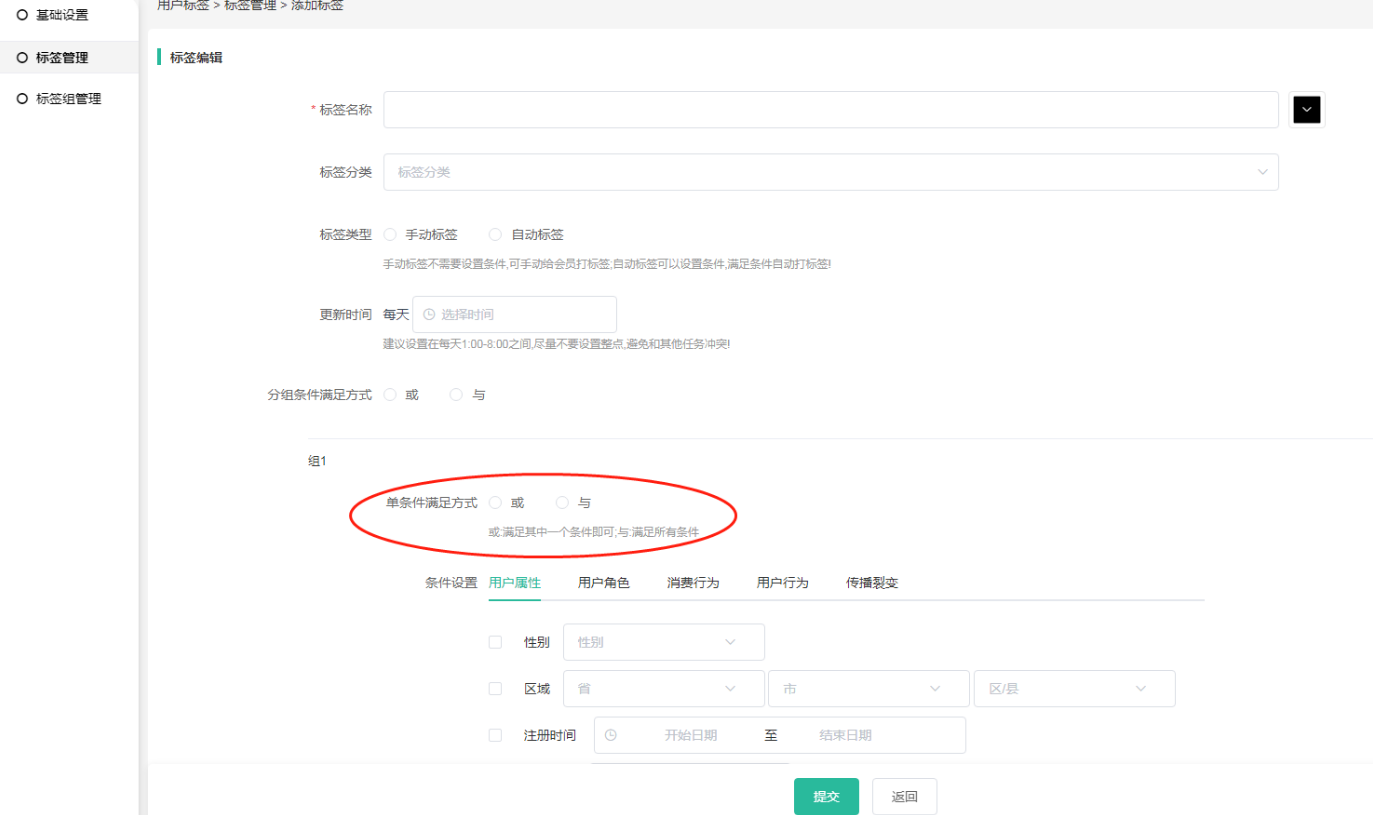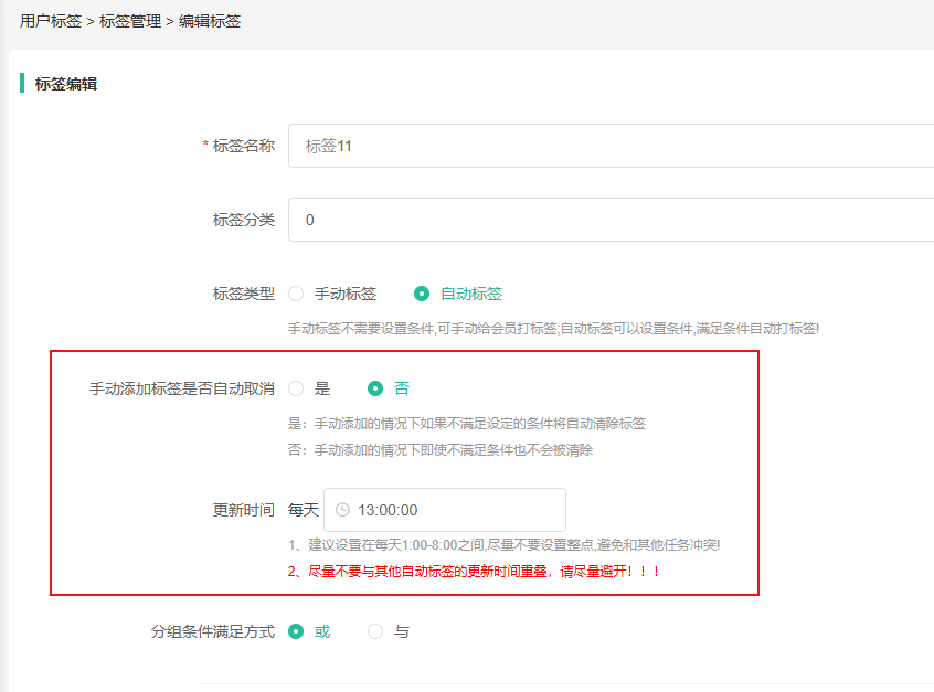 手动添加标签是否自动取消:自动标签会根据满足条件给客户自动打标签,如不满足则会去掉标签,如需要自动标签不去除的情况下可以选择否