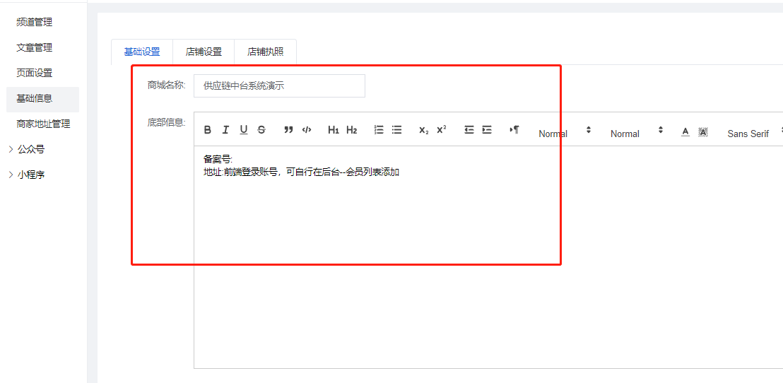登录页底部信息,可在后台–店铺–基础信息,商城名称、底部信息中进行设置,如下图: