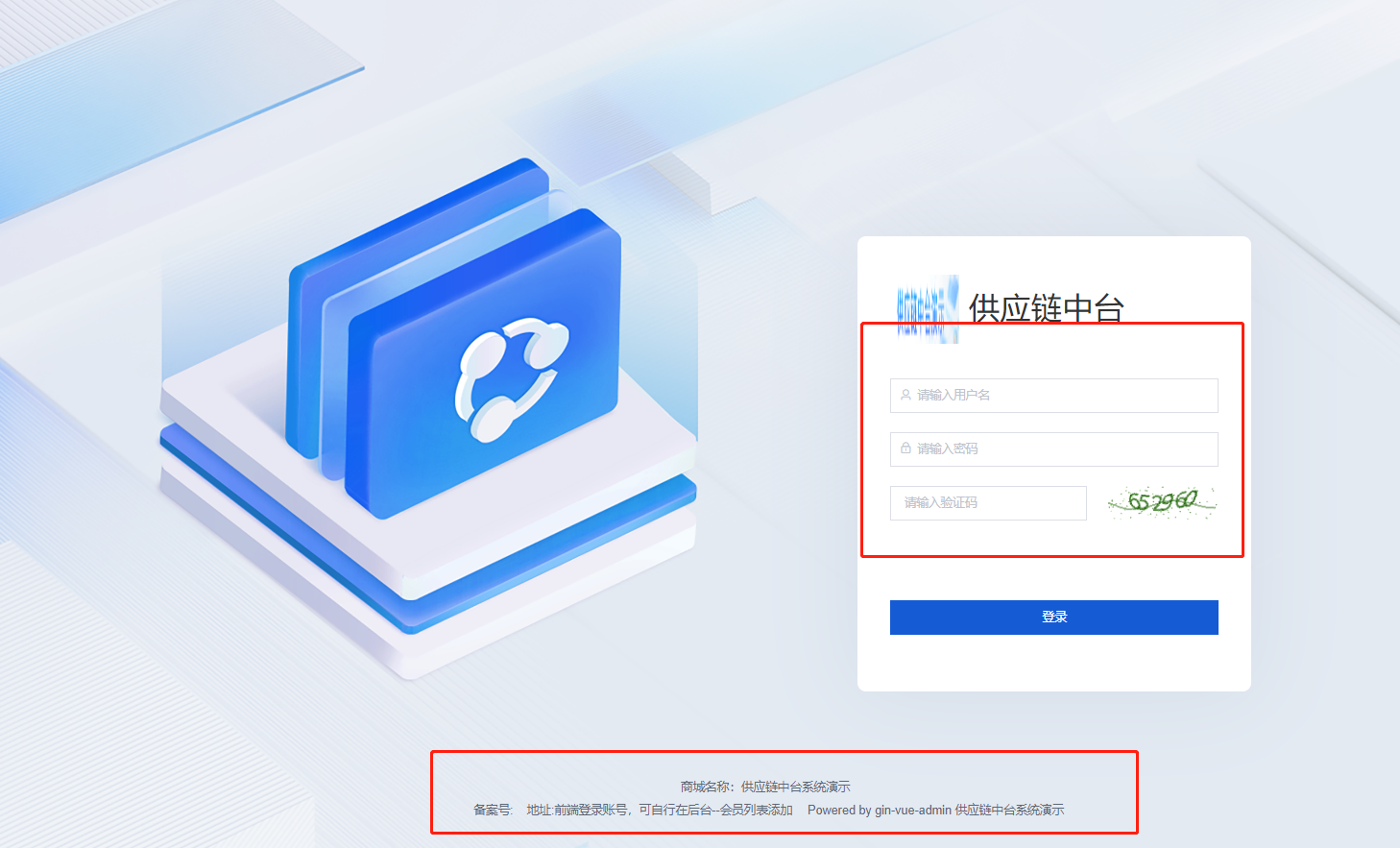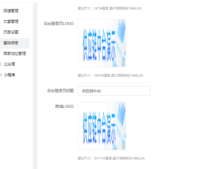 上方第一个红框的内容可以在后台–店铺–基础信息,后台登录页logo、后台登录页标题中进行设置;如下图: