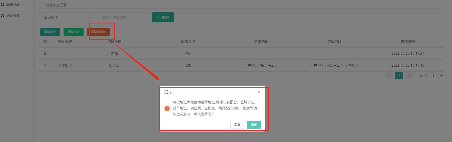 3、初始化地址:将把地址库覆盖为最新地址,可能对收银台、区域分红、订单地址、供应商、自提点、商品配送模板、租赁等功能造成影响;
