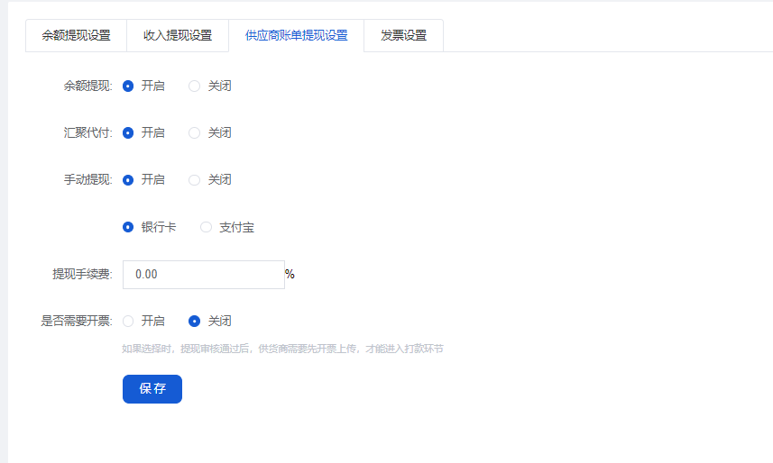 余额提现名字改成供应商账单余额提现;设置内容和余额提现一样;支持汇聚代付、手动提现,设置提现手续费