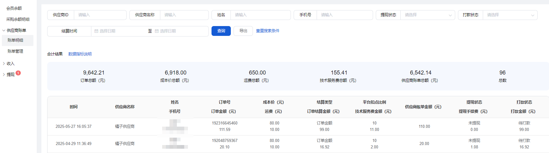 当有供应商的订单下单时会产生流水记录,记录所有跟供应商有关的订单,可以看到供应商订单 的技术服务费,提现手续费,结算金额等。