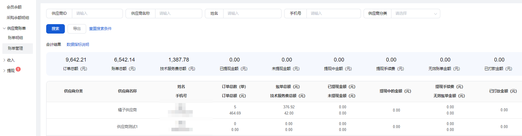 统计每个供应商的订单总数/总额,账单总额/技术服务费总额,已提现/未提现金额等信息