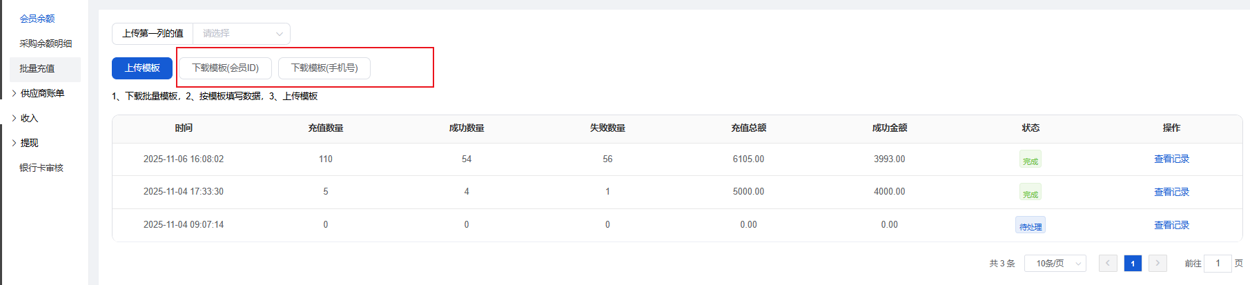 支持会员ID和手机号两种方式下载模板填写信息,充值金额保存后上传模板进行批量充值