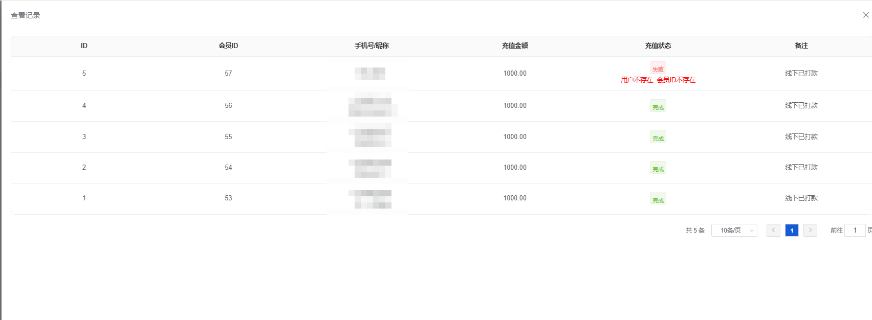 点击查看记录可以查看充值会员,充值金额以及充值状态