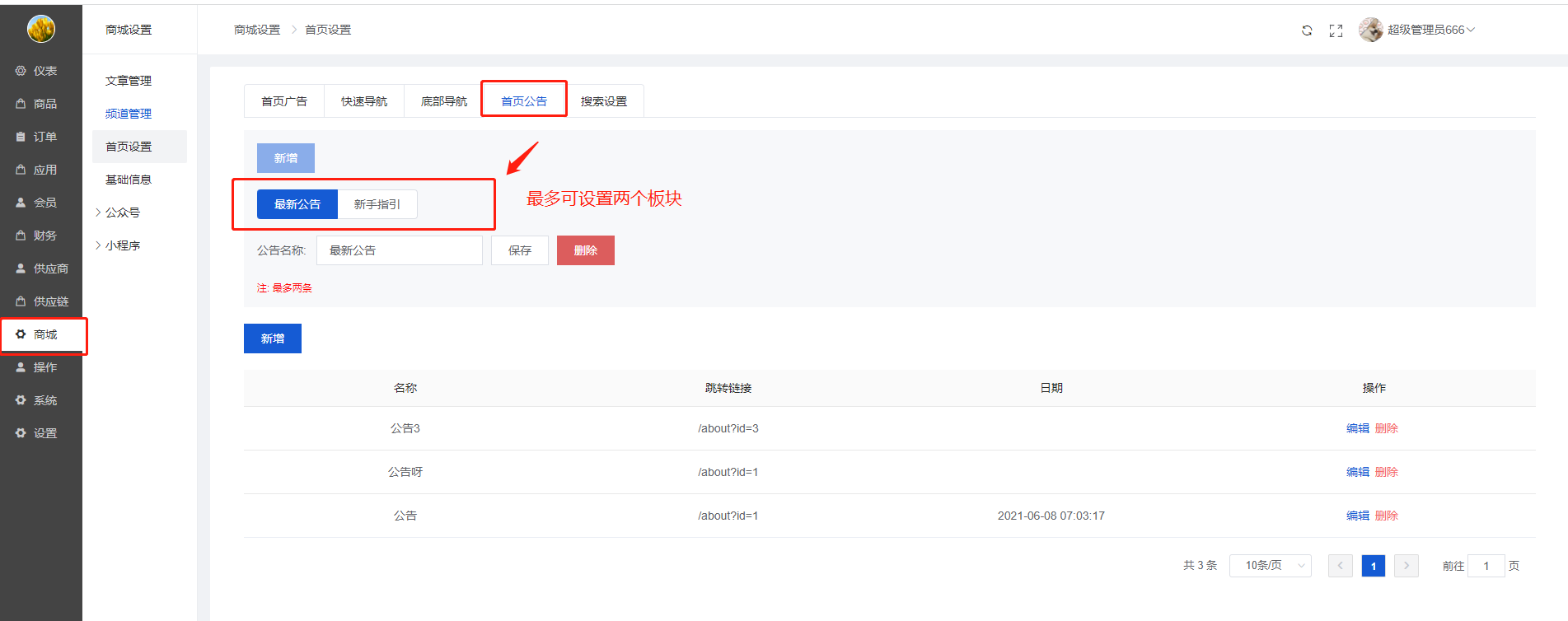 2)首页公告最多可以设置两个模块
