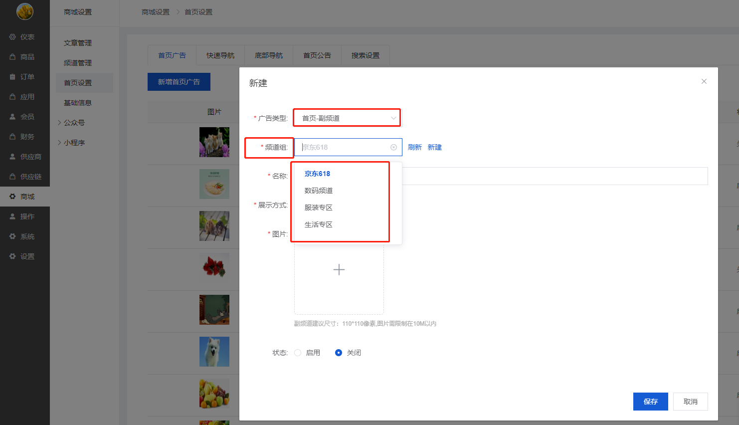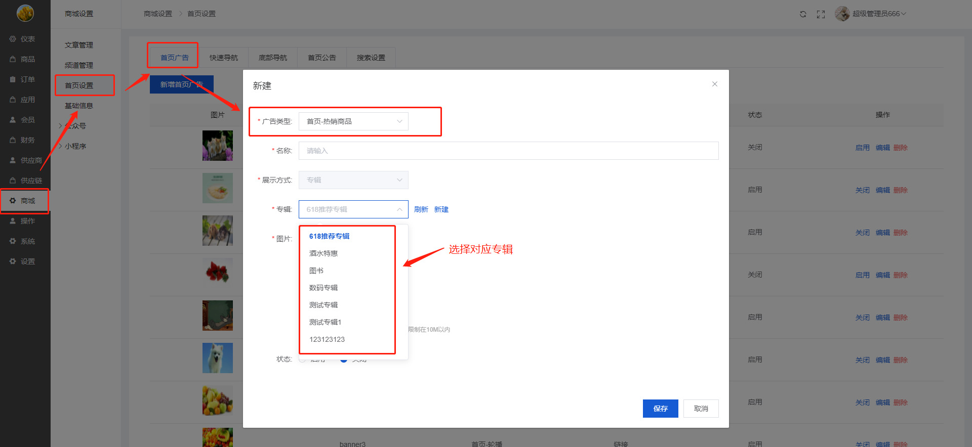 【广告类型】可以选择:首页轮播、首页-主频道、首页-副频道、首页-热销商品、首页-产品专辑、首页-推荐商品;